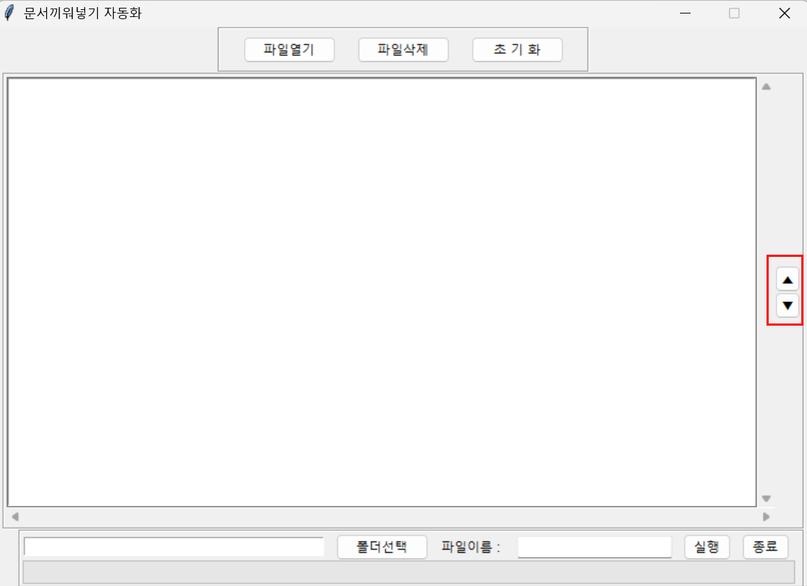 파일을 무작위로 넣으면 뒤죽박죽 섞일 수 있습니다. 프로그램 내에 있는 [정렬] 버튼을 누르거나, 파일 리스트에서 위/아래 화살표를 눌러 합쳐질 순서를 조정합니다. (파일명이 '1반_홍길동', '2반_김철수' 처럼 되어 있다면 이름순 정렬 한 번이면 끝납니다!)