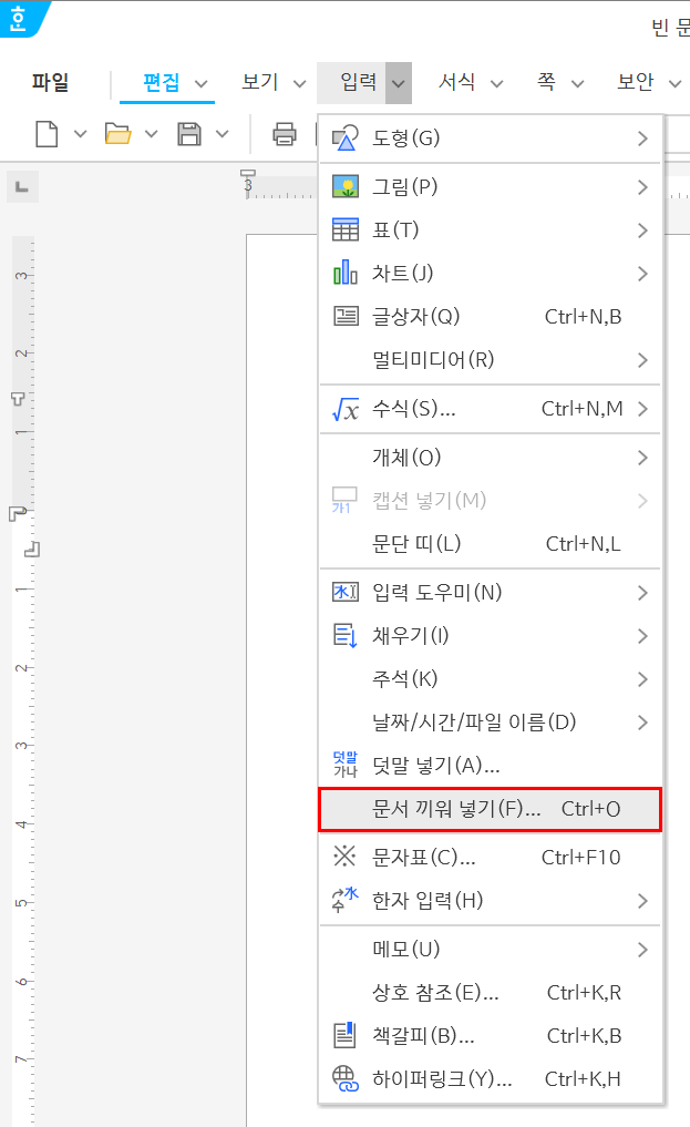 상단 메뉴에서 [입력] 탭을 누르면 나오는 펼침 메뉴 중 [문서 끼워 넣기]를 클릭합니다.