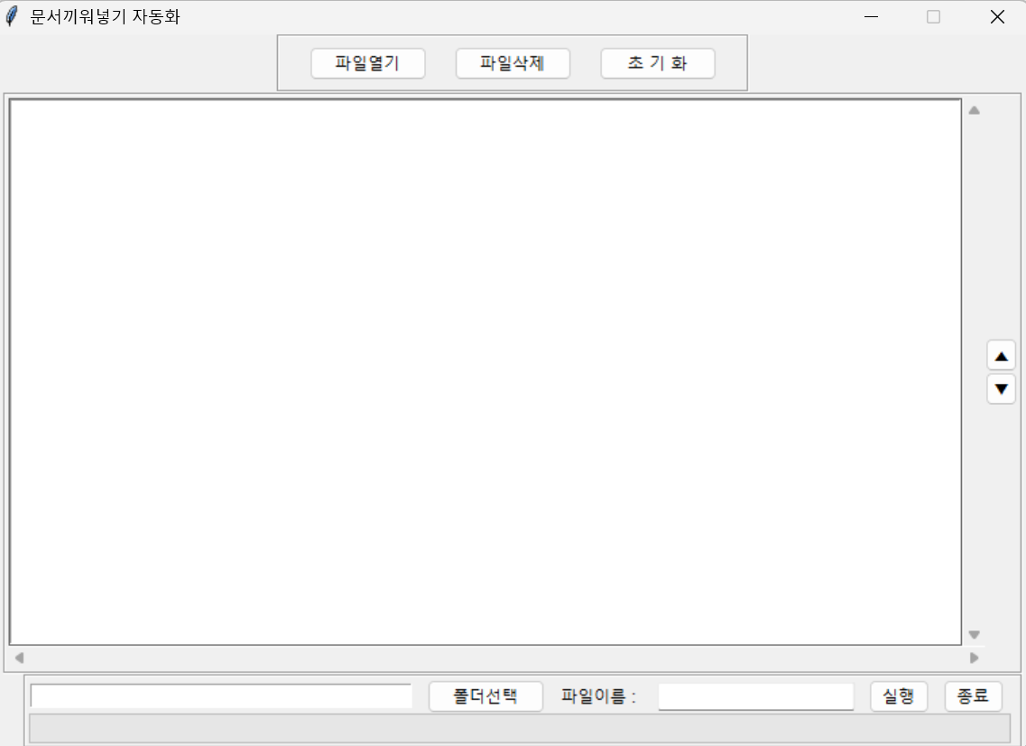 한글 문서 끼워넣기, 합치기 프로그램은 여러 개의 한글 파일을 원본 그대로 합칠 수 있고 파일을 선택하고 선택한 파일의 순서를 조절할 수 있으며, 파일명을 정하고 실행 버튼을 누르면 파일