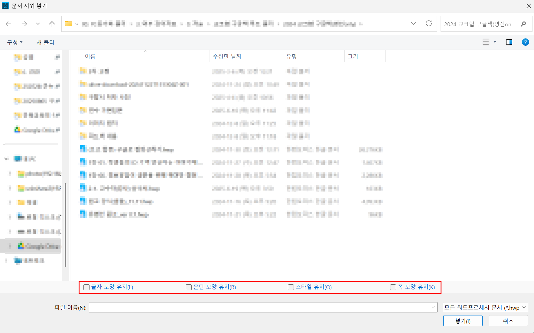 각 부서나 선생님들이 작성해주신 원본의 서식을 그대로 유지하고 싶다면 [글자 모양, 문단 모양, 스타일 유지] 쪽에 체크를 하고 확인을 누르시면 됩니다. (보통은 유지를 선택해야 표나 글자가 깨지지 않습니다.)