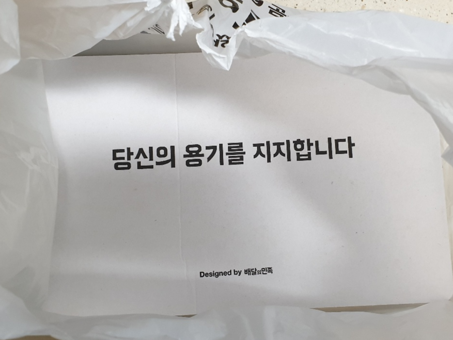 주말에 배달음식을 시켜먹은 후 쓰레기를 정리하며 문득 한 문구를 발견했다. 사실 별 문장 아니지만, 울컥했다. 이 종이는 배달용기가 비닐봉지 안에서 모양을 유지하고 잘 서있을 수 있도록 지지해주는 역할도 하겠지만, 정성스레 음식을 포장하며 (어쩌면) 아무 생각없이 이 문장을 볼 수 있는 음식점 사장님 혹은 직원에게 격려의 메시지를 줄 수도 있을 것이다. 아니면 맛있게 음식을 먹고 쓰레기를 정리하며 이 문장을 보고 울컥하는 나 같은 소비자도 있을 것이다. 제작자의 의도야 어찌 됐든 성의 없이 흐트러진 비닐봉지 안의 이 문장을 본 나는 참 많은 위로를 얻었고, 감탄을 했다.