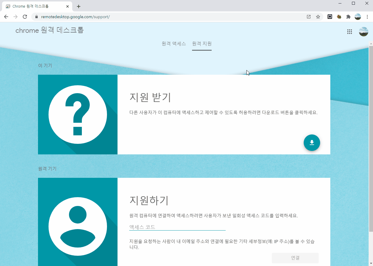 1) 위에 제공된 링크에 들어간 후 '지원받기'에서 초록색 아래 화살표를 클릭해 원격제어 확장 프로그램을 설치합니다.