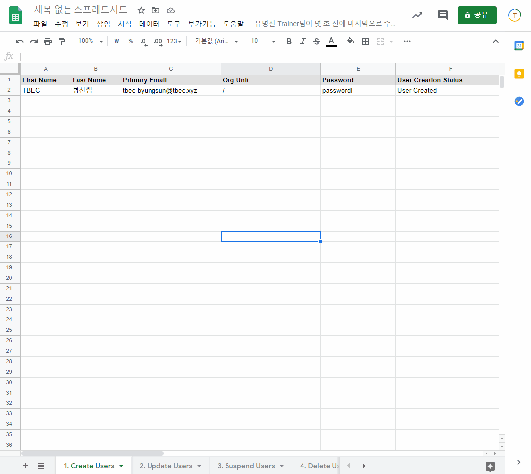 - 도메인에 등록된 사용자들이 시트에 출력되는지 확인한다.