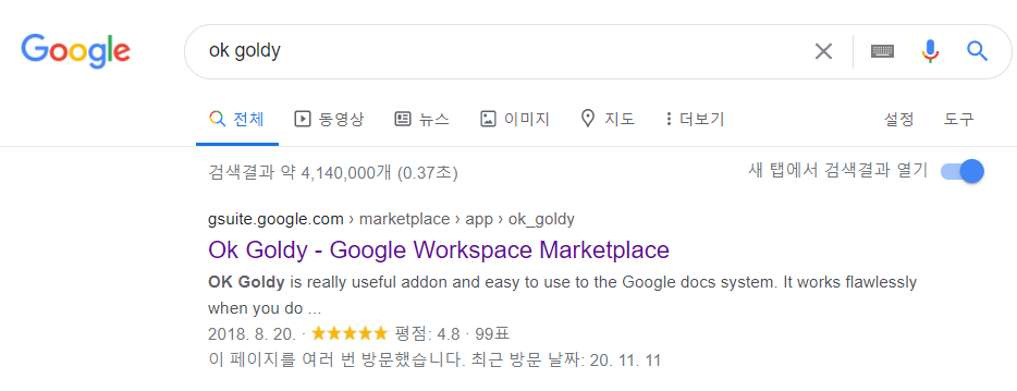 Ok Goldy는 마켓플레이스앱입니다. 마켓플레이스는 G suite 기본 기능에서 제공하지 않는 기능들을 사용자들이 직접 등록해 사용할 수 있도록 도와주는 일종의 플레이스토어의 개념으로 이해하시면 됩니다.