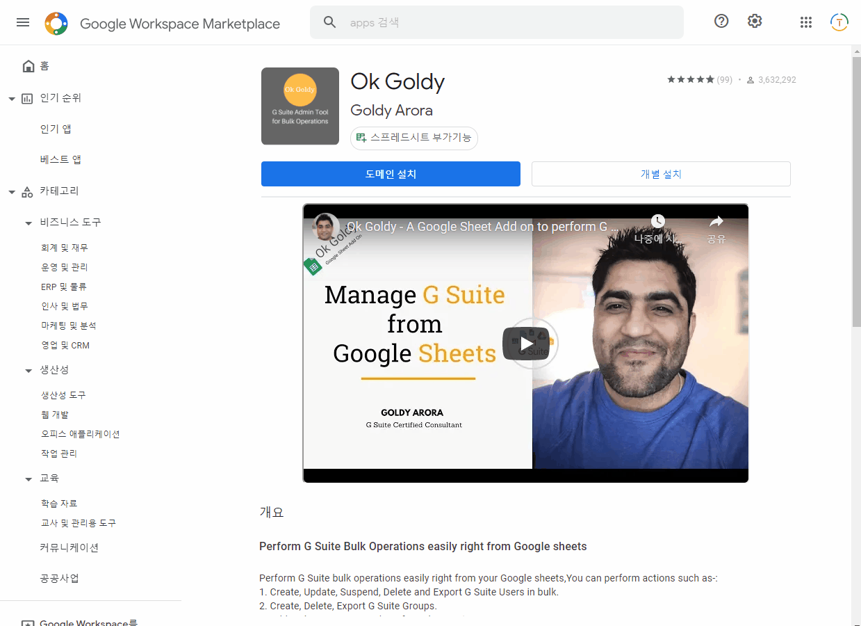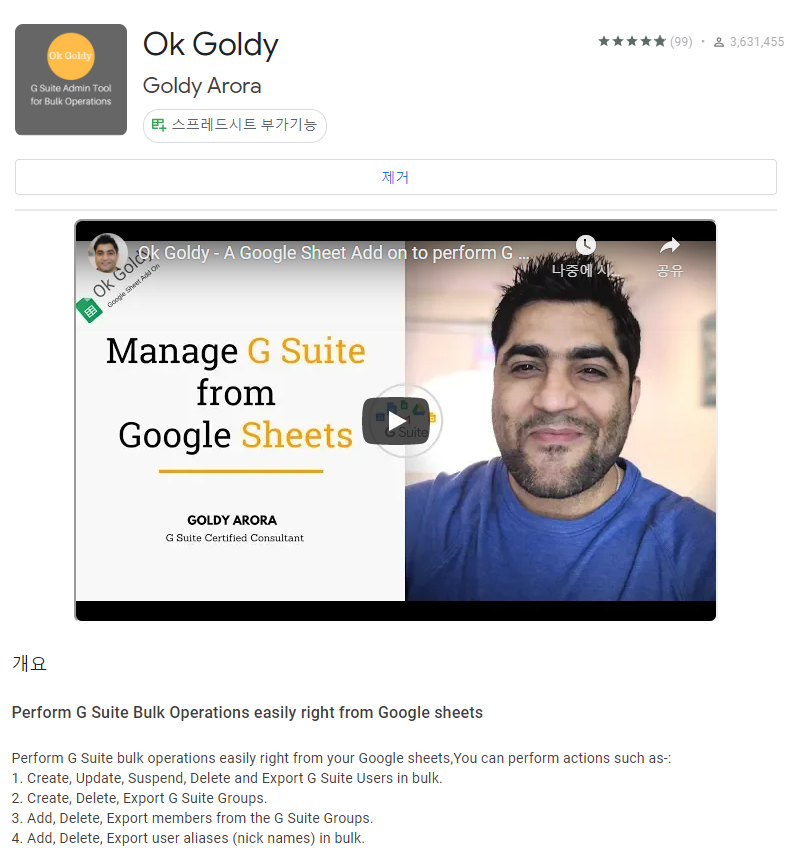 Ok Goldy는 G suite 사용자에 대한 대규모 작업을 실행할 수 있는 Google Spreadsheet에 활용할 수 있는 Add-on입니다. (참고: Add-on은 뭐고 Extension은 뭐예요?)Goldy Arora라는 개발자가 제작했고, 이 분은 G suite에서 유용하게 쓸 수 있는 다양한 앱을 개발했습니다. (Goldy Arora 개발자 홈페이지)