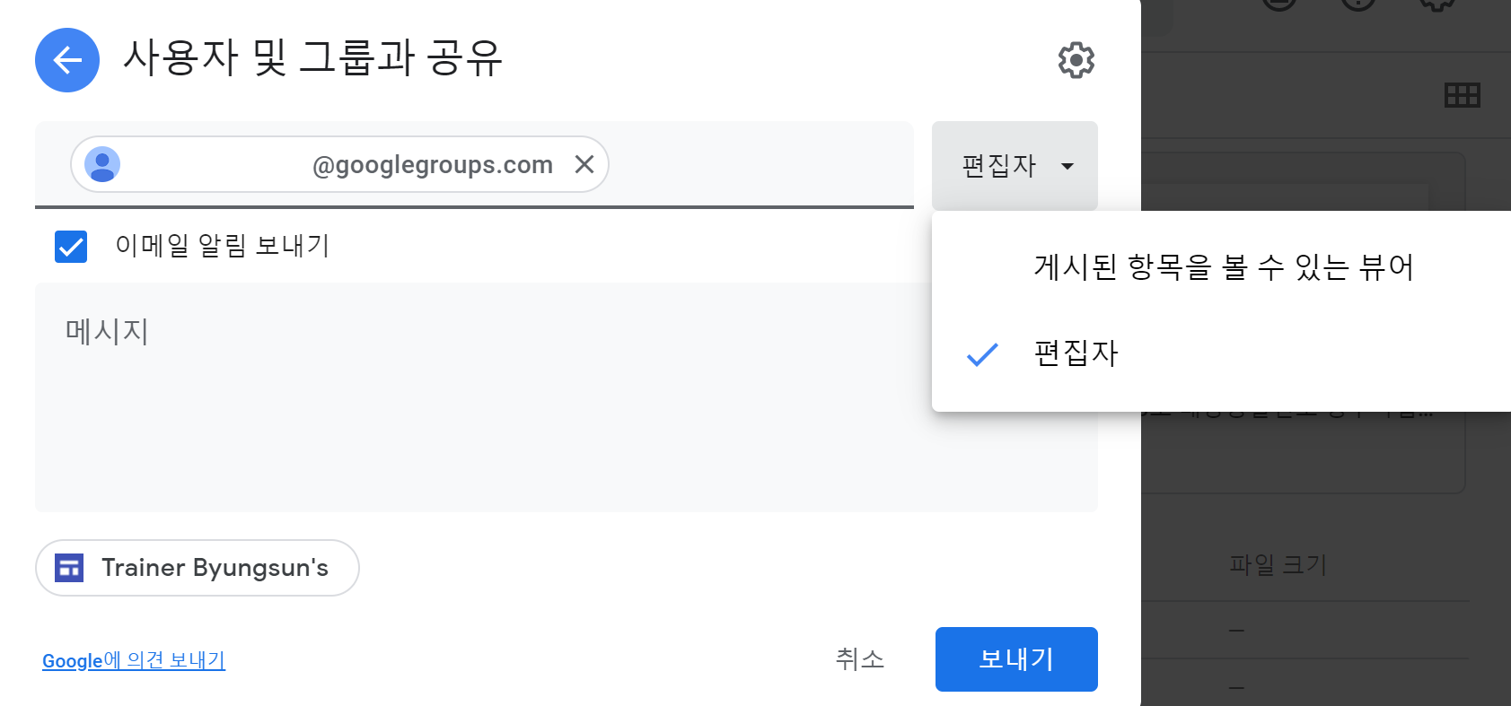 특정 파일을 '뷰어'로 공유했다가 '편집자'권한을 주고 싶은데, 만약 이게 10명이라면 10번을 반복해야겠지요.