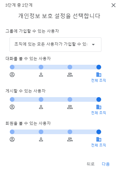 * 그룹에 가입할 수 있는 사용자: 초대된 사용자만 / 조직 내 모든 사용자가 요청 가능 / 조직에 있는 모든 사용자가 가입할 수 있음
