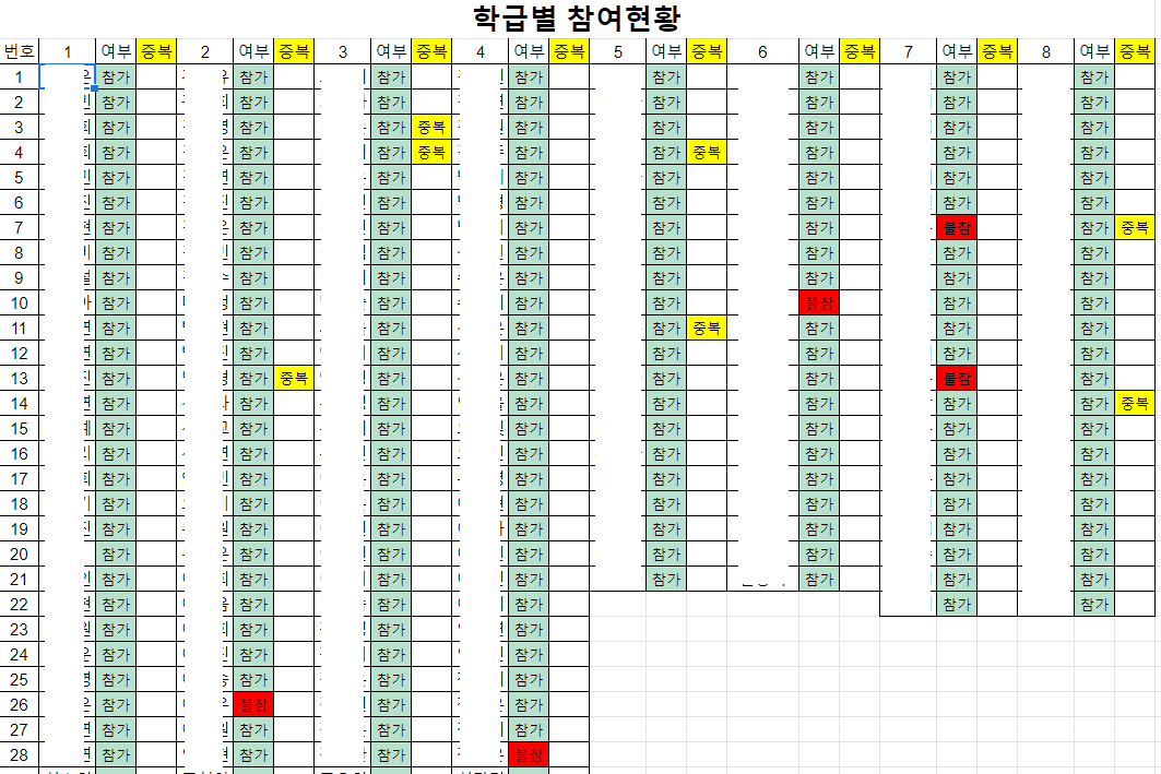 * 조건부 서식을 활용해 '불참' 값을 빨간색으로 지정할 경우 더욱더 쉽게 불참자를 파악할 수 있습니다.