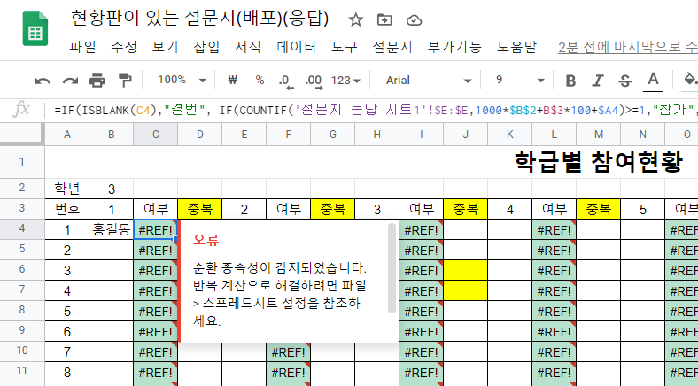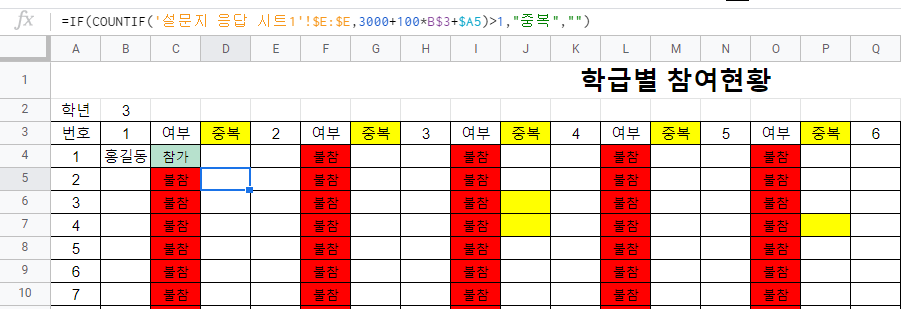 =if(isblank(b6), "결번", if(countif('설문지 응답 시트1'!$E:$E,1000*$B$2+B$3*100+$A4)>=1,"참가","불참"))