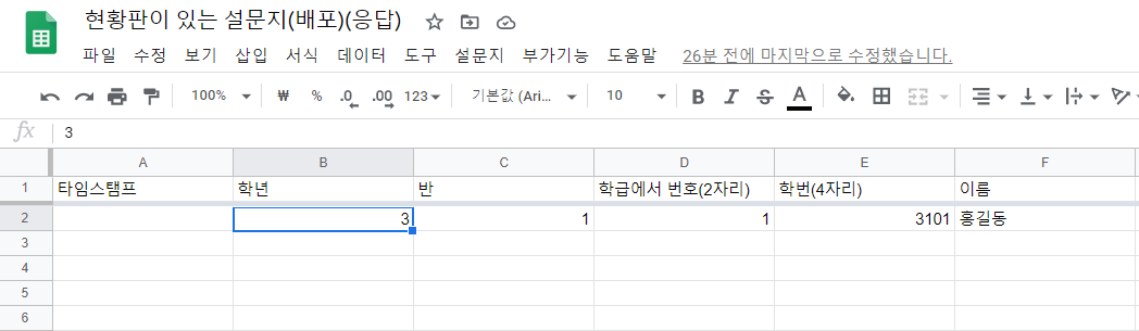 위의 그림에서 볼 수 있듯 학년, 반의 문항에 대해 학생이 답변을 하면 DB시트에는 아래와 같이 기록됩니다.