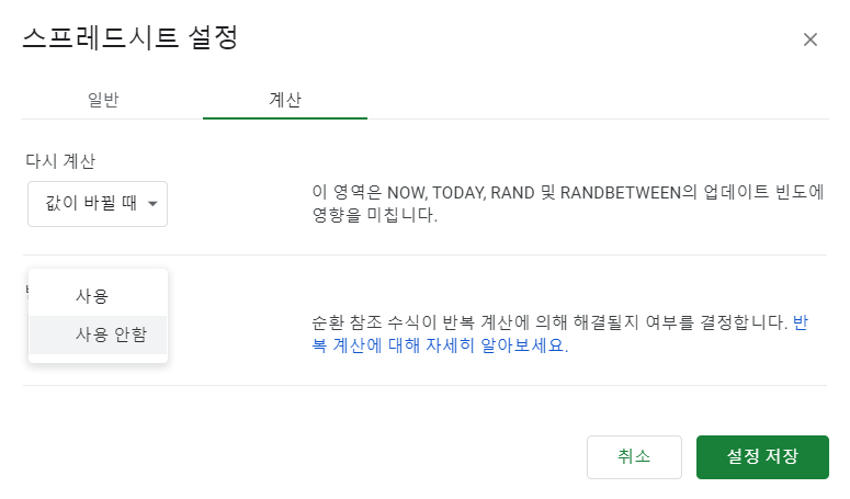 * 파일 - 스프레드시트 설정 - 계산 - 반복 계산에서 '사용 안 함'을 '사용'으로 설정