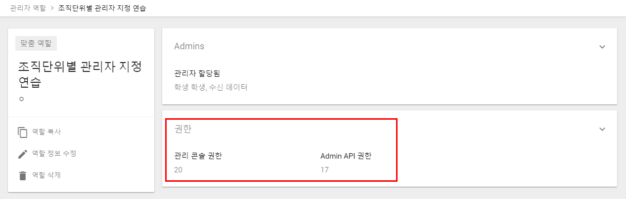 관리콘솔에서 관리자 맞춤역할을 설정해 단위학교 조직에 대해서만 권한을 갖도록 설정하는 방법입니다.