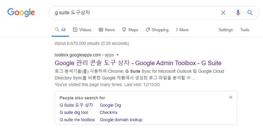 - 구글 검색창에 'G suite 도구상자'라고 검색 후 Google 관리 콘솔 도구 상자를 클릭합니다. (http://toolbox.googleapps.com/apps/dig/)