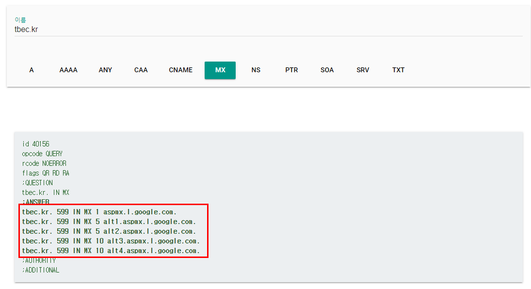 - 이어 출력되는 MX 레코드값을 확인합니다.