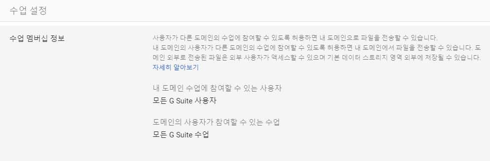 1. 관리콘솔 - 앱 - Google Workspace - Classroom - 수업설정 - 수업 멤버십 정보 - 아래와 같이 설정