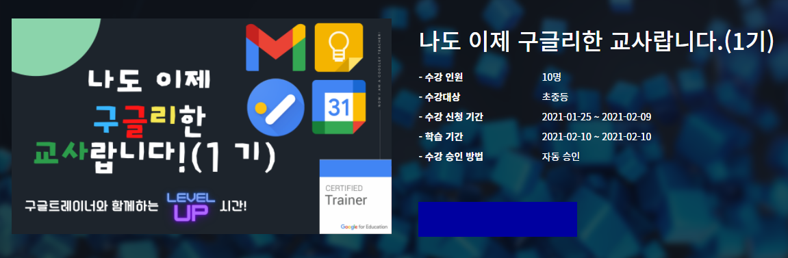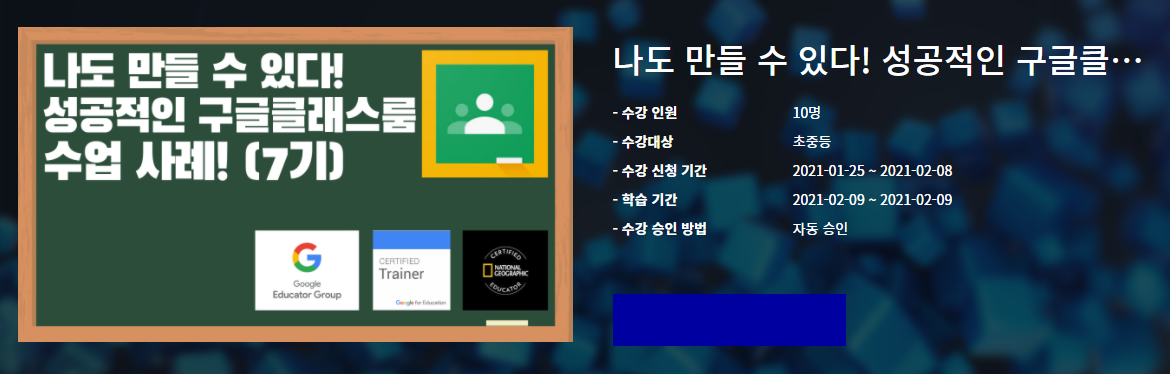 | 1 차시 | 구글클래스룸 맞춤형 과제, 과정 중심 평가 디자인 나도 할 수 있다! (2월 9일(화) 13:00~13:50) |