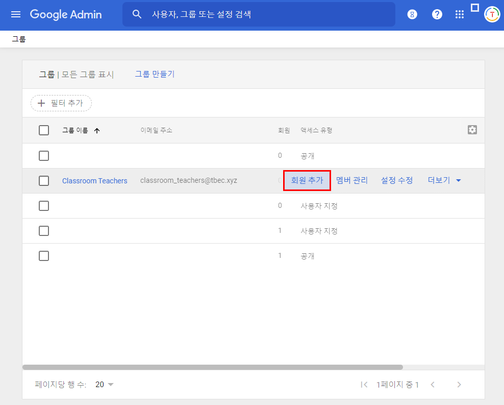 2) 'Classroom Teachers'라는 그룹에 '회원 추가' 버튼을 누른 후, 해당 교사의 계정을 입력해 회원으로 추가합니다.
