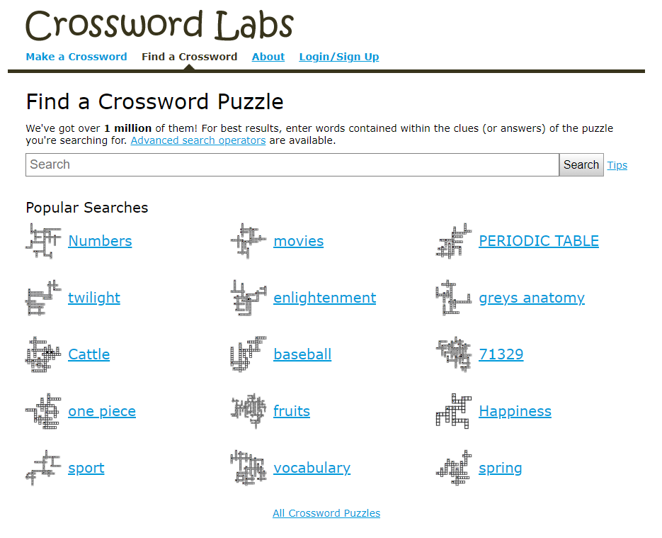 'Find a Crossword' 탭을 눌러보면 다양한 카테고리에 따라, 사용자들이 이미 만들어놓은 크로스워드 퀴즈를 풀 수 있습니다.교수자가 아닌 학습자로서의 접근으로도 훌륭한 공부자료가 될 수 있을 것 같습니다.